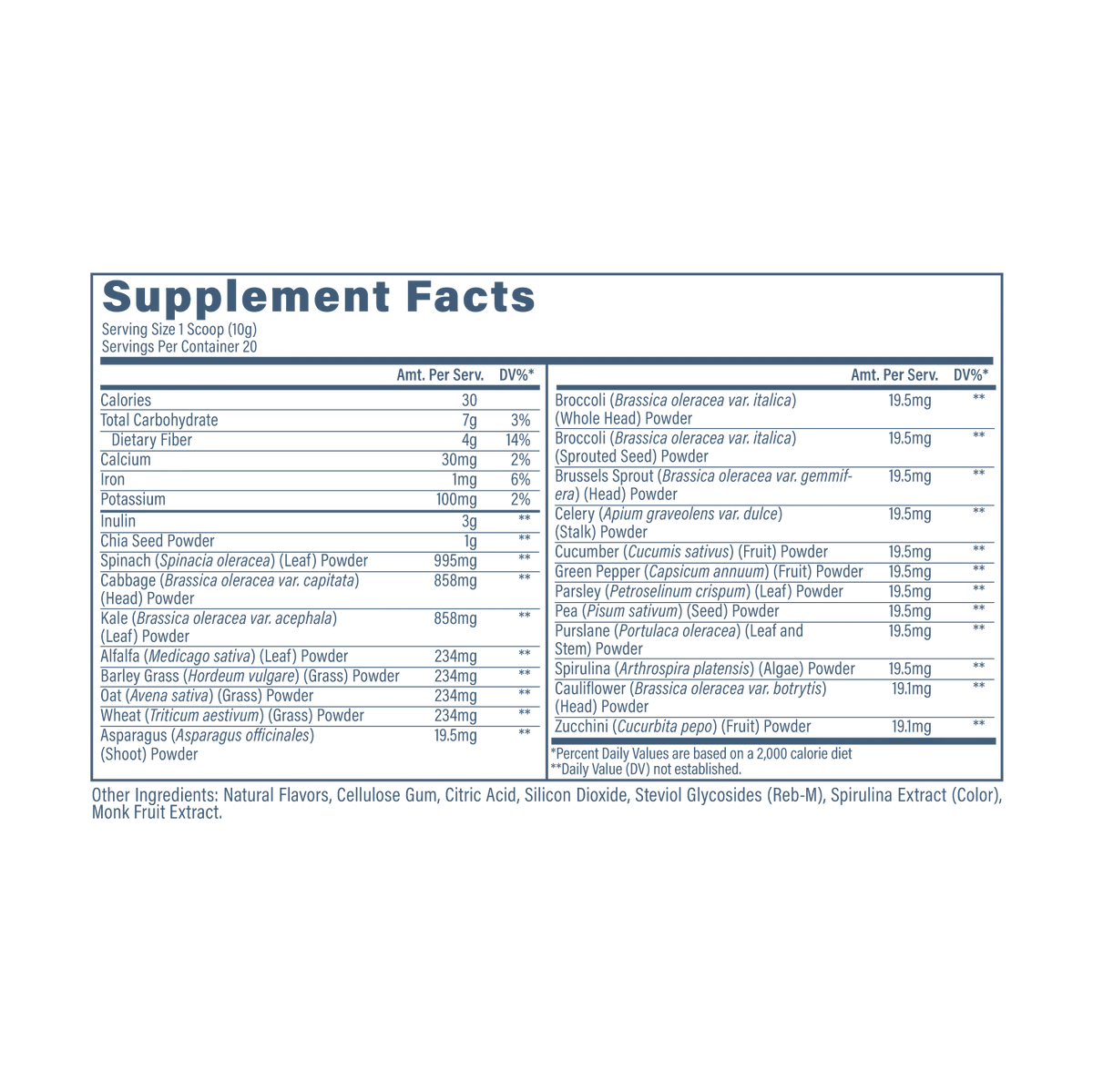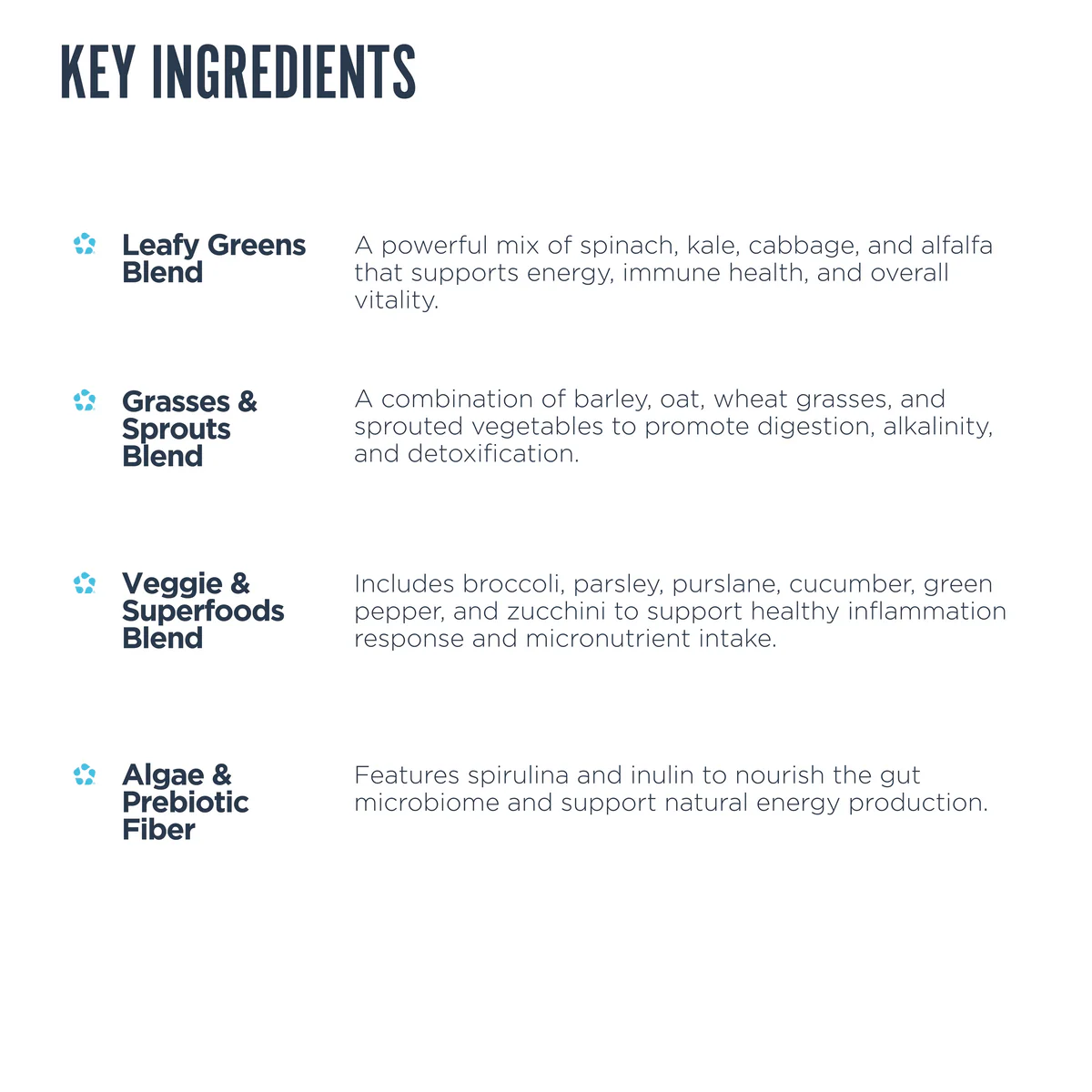 - Superfood Greens Blend – Nutrient-dense blend of greens and grasses sourced from whole-food ingredients