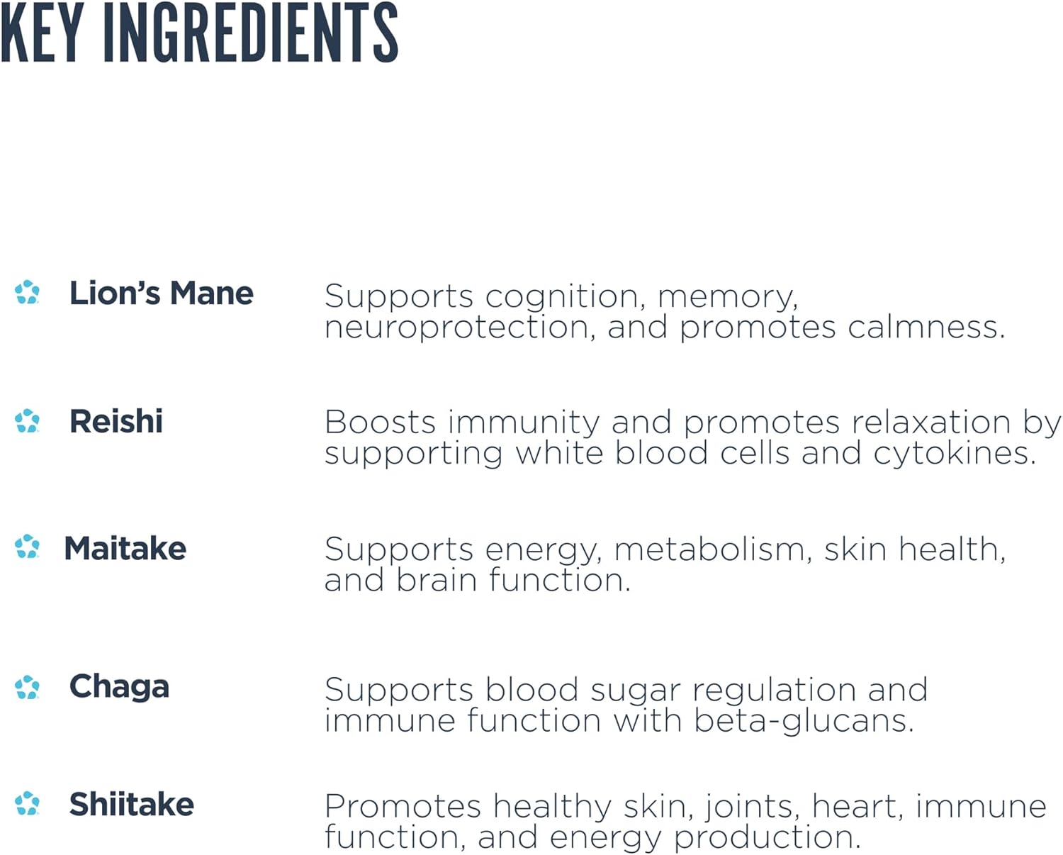 - Fruiting Body Sourcing – All five mushroom ingredients are derived exclusively from fruiting bodies rather than mycelium; fruiting body extracts are documented to contain higher concentrations of target compounds compared to mycelium-on-grain preparations