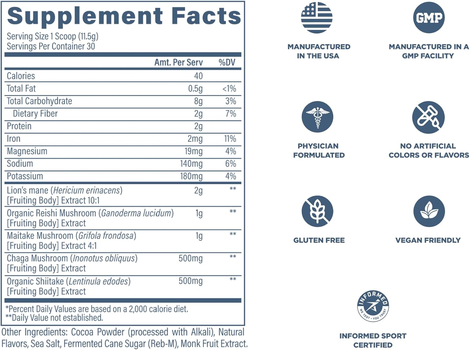 - Other Ingredients – Cocoa Powder (processed with Alkali), Natural Flavors, Sea Salt, Fermented Cane Sugar (Reb-M), Monk Fruit Extract